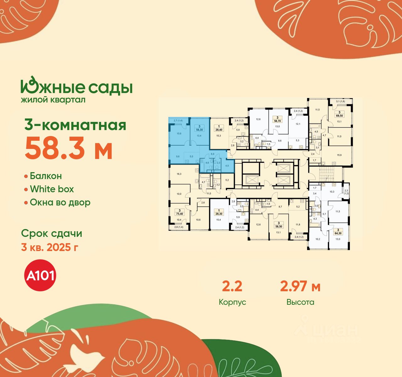 Продается трехкомнатная квартира 539 в новостройке ЖК "Южные Сады" по адресу Москва, ЮЗАО, Южное Бутово, Жилой комплекс "Южные Сады", корп.2.2. Общая площадь квартиры - 58.30 кв. м., этаж 30 из 30, секция 4. Тип проекта, по которому построен дом - монолит, компания-застройщик - ООО "А101". Стоимость квартиры - 23250040 Р. Срок сдачи - 4 квартал 2025.