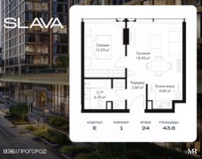 В продаже 1-комнатная квартира площадью 43.60 м² на 24-м этаже корпуса E.