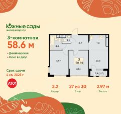 Продается трехкомнатная квартира 512 в новостройке ЖК "Южные Сады" по адресу Москва, ЮЗАО, Южное Бутово, Жилой комплекс "Южные Сады", корп.2.2. Общая площадь квартиры - 58.60 кв. м., этаж 27 из 30, секция 4. Тип проекта, по которому построен дом - монолит, компания-застройщик - ООО "А101". Стоимость квартиры - 26750314 Р. Срок сдачи - 4 квартал 2025.