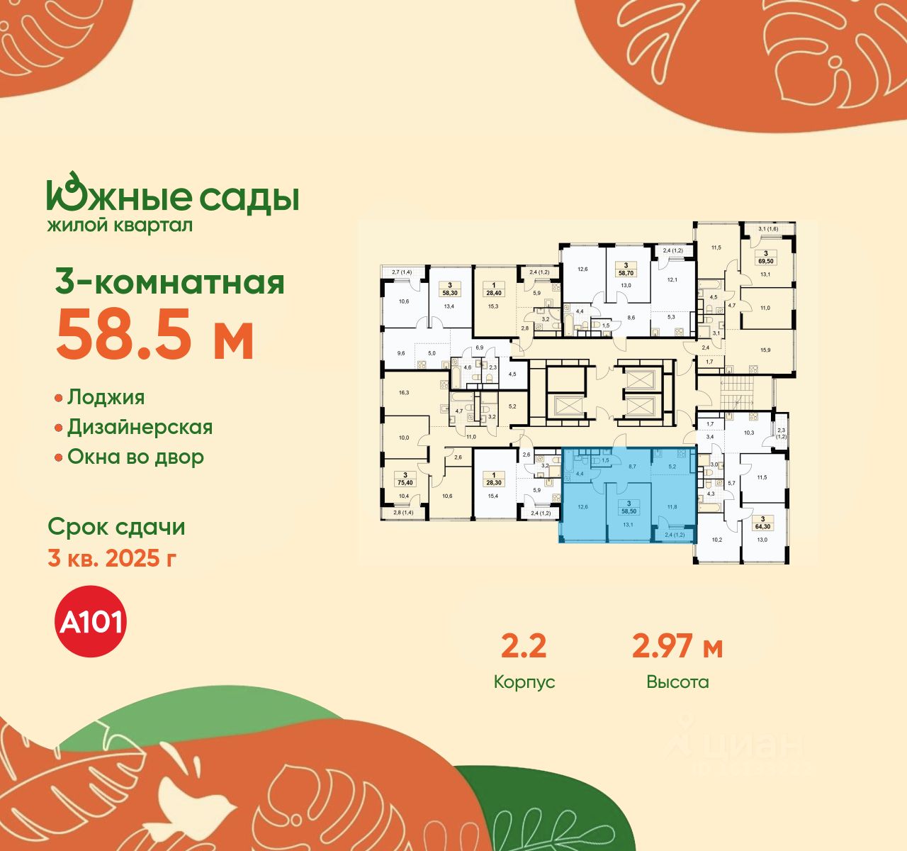 Продается трехкомнатная квартира 536 в новостройке ЖК "Южные Сады" по адресу Москва, ЮЗАО, Южное Бутово, Жилой комплекс "Южные Сады", корп.2.2. Общая площадь квартиры - 58.50 кв. м., этаж 30 из 30, секция 4. Тип проекта, по которому построен дом - монолит, компания-застройщик - ООО "А101". Стоимость квартиры - 25769835 Р. Срок сдачи - 4 квартал 2025.