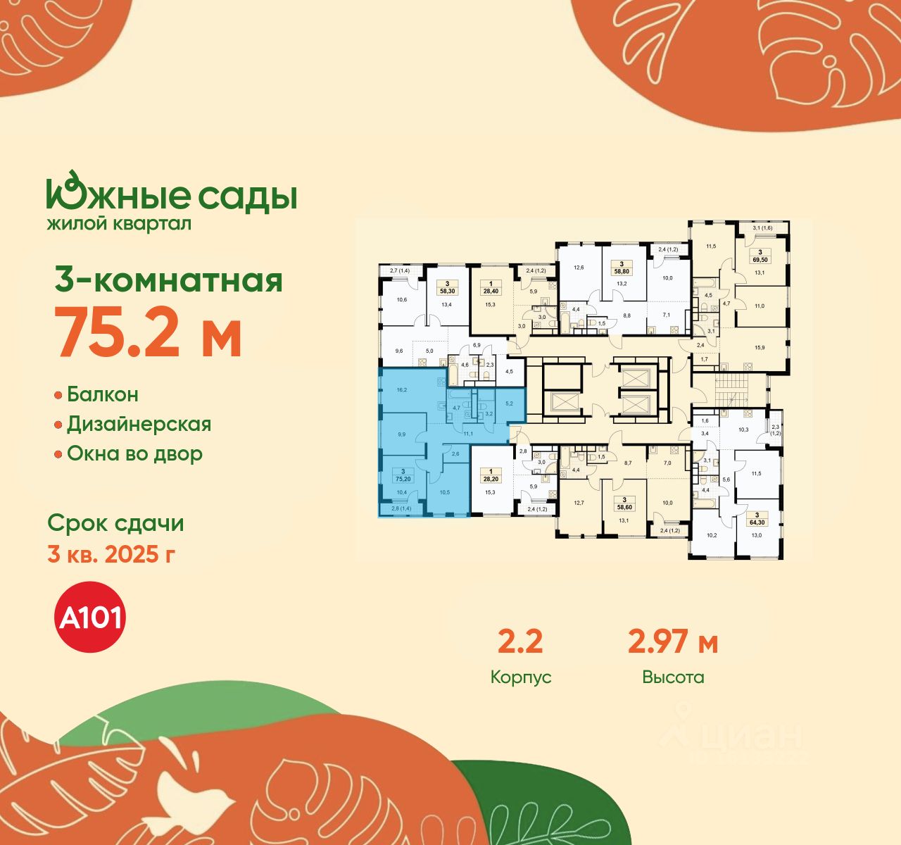 Продается трехкомнатная квартира 482 в новостройке ЖК "Южные Сады" по адресу Москва, ЮЗАО, Южное Бутово, Жилой комплекс "Южные Сады", корп.2.2. Общая площадь квартиры - 75.20 кв. м., этаж 23 из 30, секция 4. Тип проекта, по которому построен дом - монолит, компания-застройщик - ООО "А101". Стоимость квартиры - 29741600 Р. Срок сдачи - 4 квартал 2025.