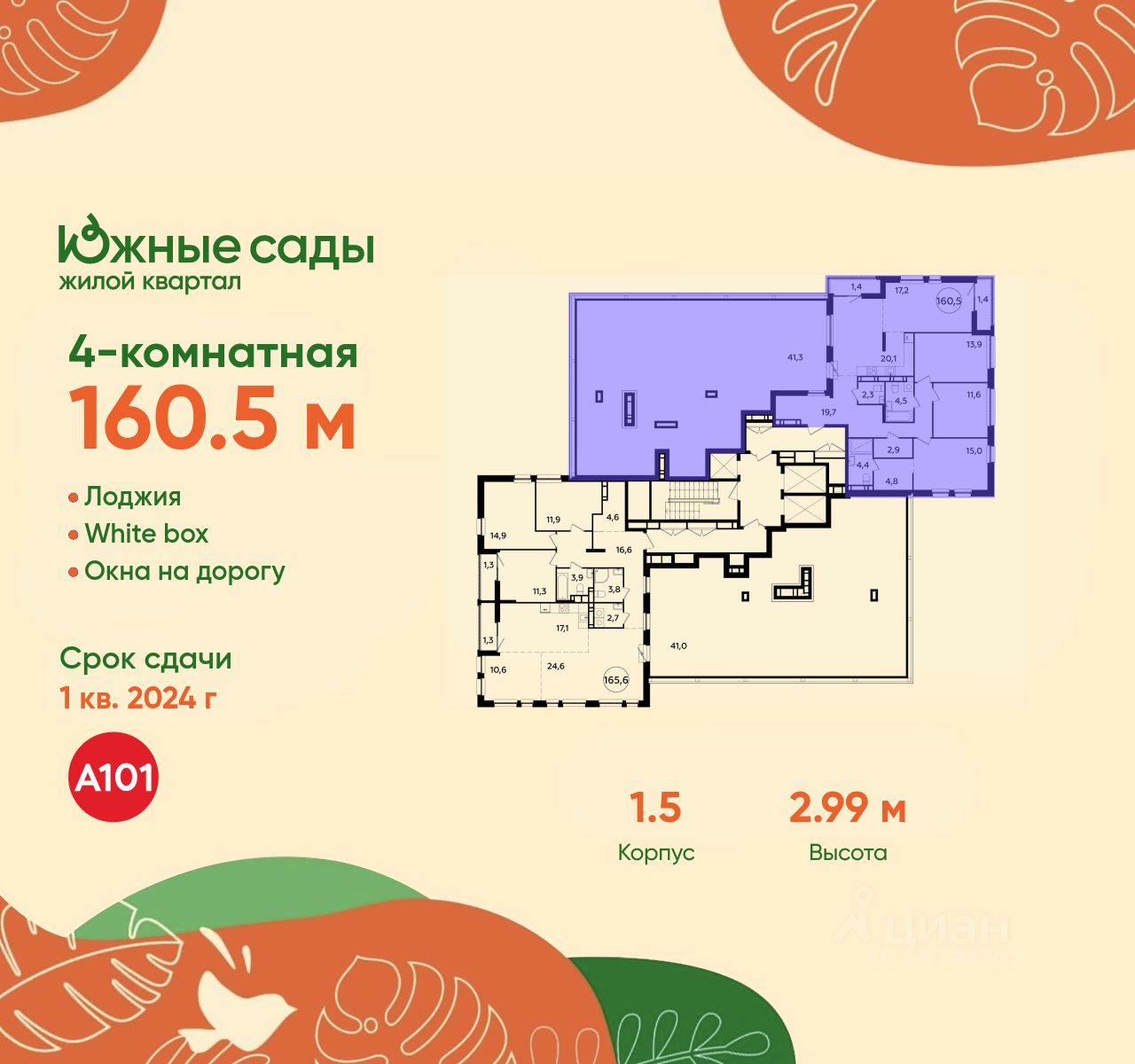 Продается четырехкомнатная квартира 1149 в новостройке ЖК "Южные Сады" по адресу Москва, ЮЗАО, Южное Бутово, Бартеневская улица, 18к2, Москва. Общая площадь квартиры - 160.50 кв. м., этаж 23 из 23, секция 5. Тип проекта, по которому построен дом - монолит, компания-застройщик - ООО "А101". Стоимость квартиры - 47621300 Р.