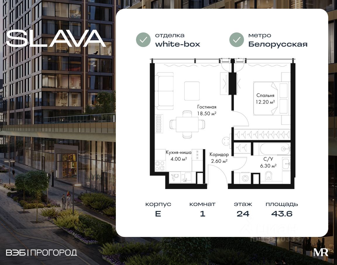 В продаже 1-комнатная квартира площадью 43.60 м² на 24-м этаже корпуса E.