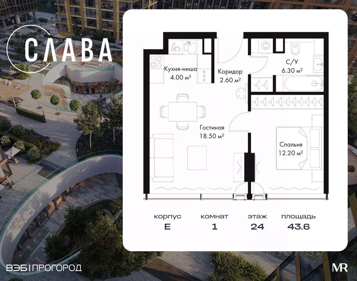 В продаже 1-комнатная квартира площадью 43.60 м² на 24-м этаже корпуса E.