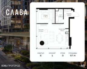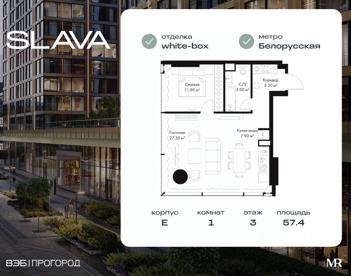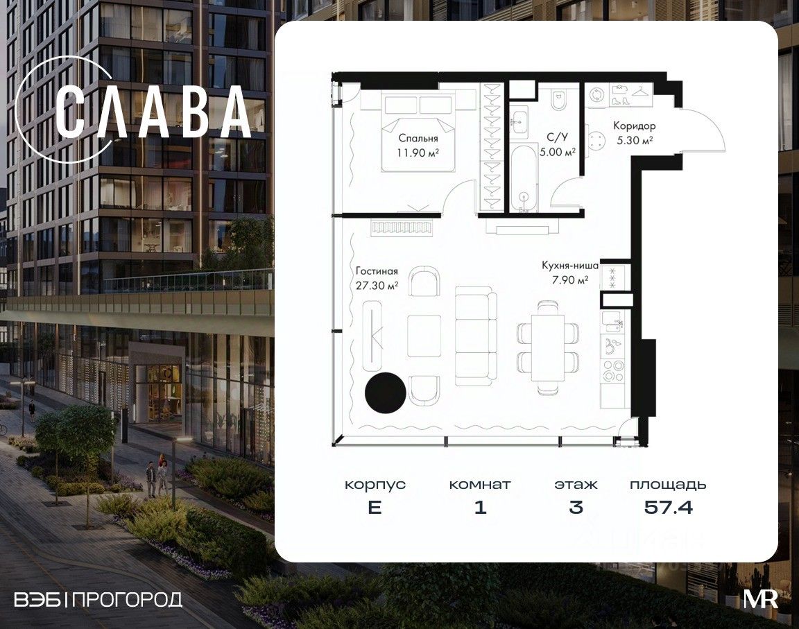 В продаже 1-комнатная квартира площадью 57.40 м² на 3-м этаже корпуса E.