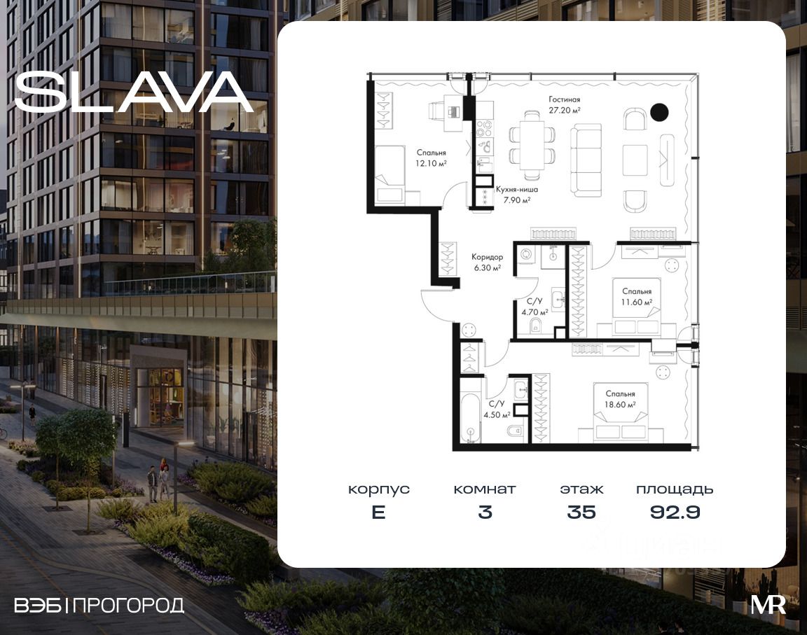 В продаже 3-комнатная квартира площадью 92.90 м² на 35-м этаже корпуса E.