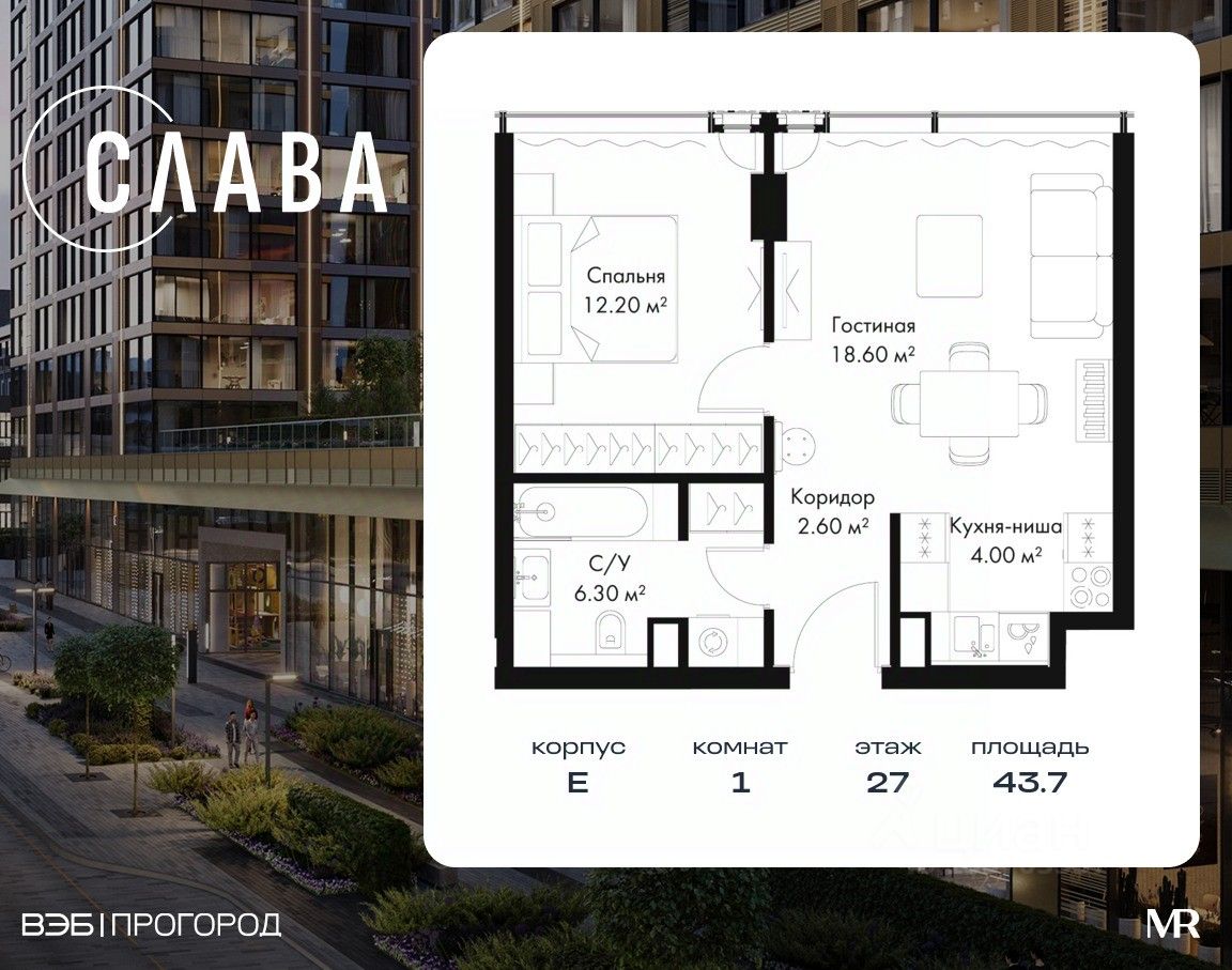 В продаже 1-комнатная квартира площадью 43.70 м² на 27-м этаже корпуса E.