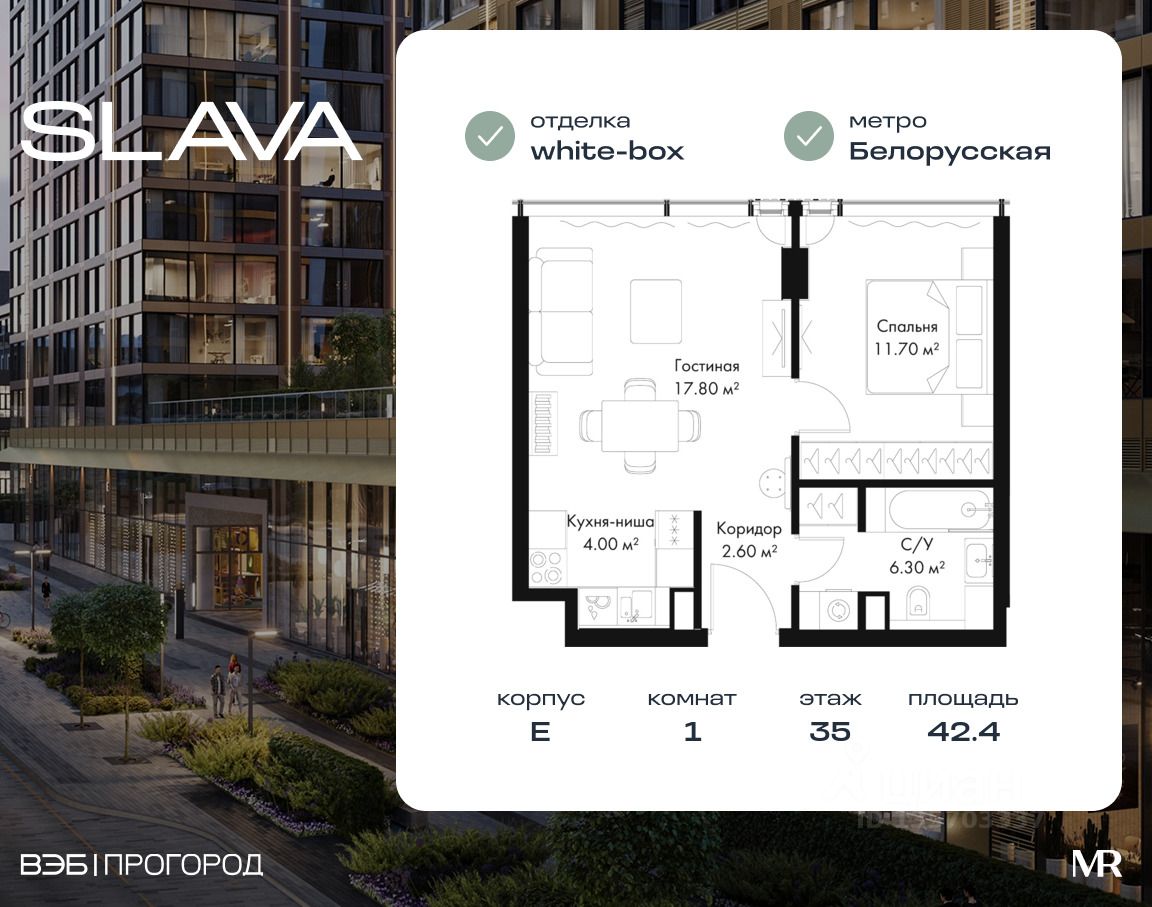 В продаже 1-комнатная квартира площадью 42.40 м² на 35-м этаже корпуса E.