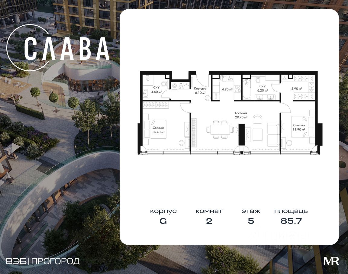 В продаже 2-комнатная квартира площадью 85.70 м² на 5-м этаже корпуса G.