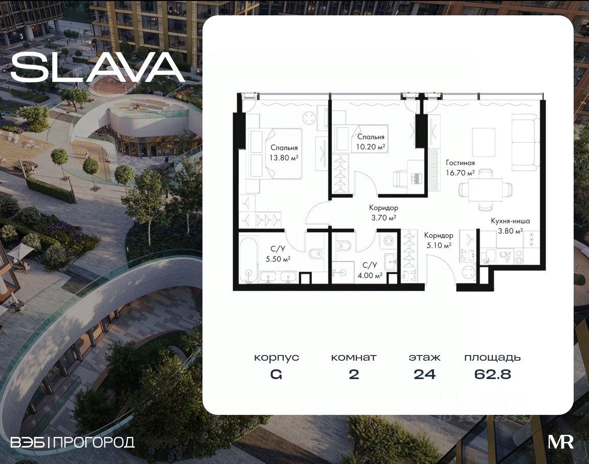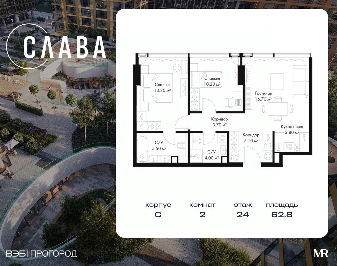 В продаже 2-комнатная квартира площадью 62.80 м² на 24-м этаже корпуса G.