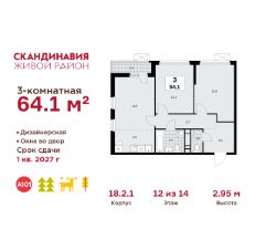 Продается трехкомнатная квартира 52 в новостройке Жилой район "Скандинавия" по адресу Москва, ТиНАО, Новомосковский АО, Сосенское С/П, Коммунарка пос., жилой комплекс Скандинавия, 18.2.1, район Коммунарка, Новомосковский административный округ, Москва. Общая площадь квартиры - 64.10 кв. м., этаж 12 из 14, секция 1. Тип проекта, по которому построен дом - монолит, компания-застройщик - ООО "А101". Стоимость квартиры - 24195186 Р. Срок сдачи - 1 квартал 2027.