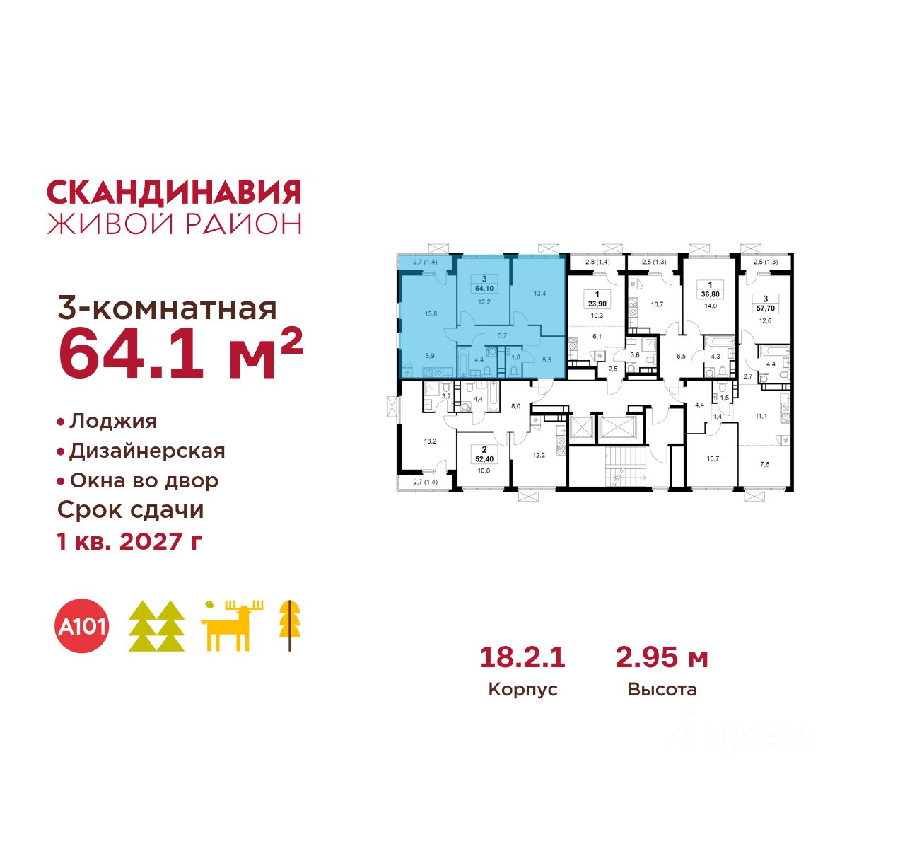 Продается трехкомнатная квартира 52 в новостройке Жилой район "Скандинавия" по адресу Москва, ТиНАО, Новомосковский АО, Сосенское С/П, Коммунарка пос., жилой комплекс Скандинавия, 18.2.1, район Коммунарка, Новомосковский административный округ, Москва. Общая площадь квартиры - 64.10 кв. м., этаж 12 из 14, секция 1. Тип проекта, по которому построен дом - монолит, компания-застройщик - ООО "А101". Стоимость квартиры - 26985459 Р. Срок сдачи - 1 квартал 2027.