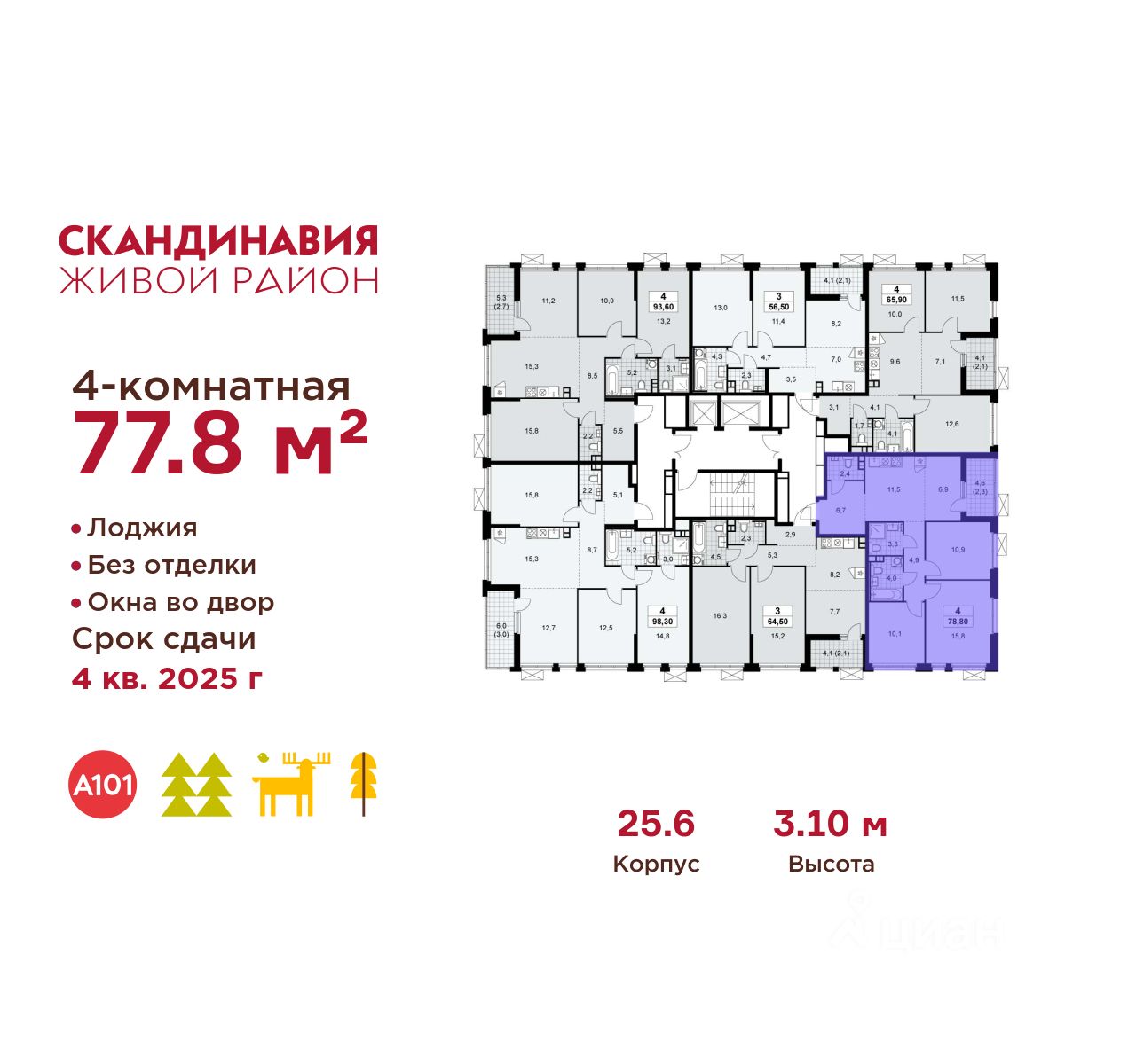 Продается четырехкомнатная квартира 1020 в новостройке Жилой район "Скандинавия" по адресу Москва, ТиНАО, Новомосковский АО, Сосенское С/П, Коммунарка пос., жилой комплекс Скандинавия, 25.6, район Коммунарка, Новомосковский административный округ, Москва. Общая площадь квартиры - 77.80 кв. м., этаж 16 из 17, секция 11. Тип проекта, по которому построен дом - монолит, компания-застройщик - ООО "А101". Стоимость квартиры - 30929390 Р. Срок сдачи - 1 квартал 2026.