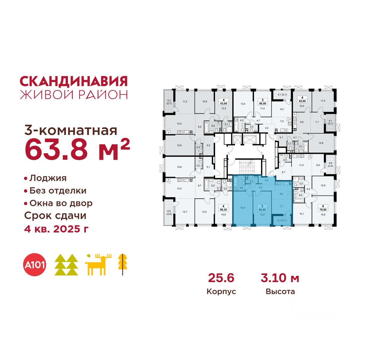 Продается трехкомнатная квартира 1015 в новостройке Жилой район "Скандинавия" по адресу Москва, ТиНАО, Новомосковский АО, Сосенское С/П, Коммунарка пос., жилой комплекс Скандинавия, 25.6, район Коммунарка, Новомосковский административный округ, Москва. Общая площадь квартиры - 63.80 кв. м., этаж 15 из 17, секция 11. Тип проекта, по которому построен дом - монолит, компания-застройщик - ООО "А101". Стоимость квартиры - 24595538 Р. Срок сдачи - 1 квартал 2026.