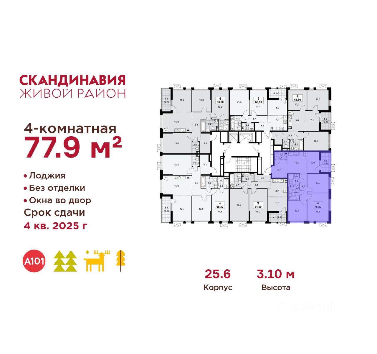 Продается четырехкомнатная квартира 1014 в новостройке Жилой район "Скандинавия" по адресу Москва, ТиНАО, Новомосковский АО, Сосенское С/П, Коммунарка пос., жилой комплекс Скандинавия, 25.6, район Коммунарка, Новомосковский административный округ, Москва. Общая площадь квартиры - 77.90 кв. м., этаж 15 из 17, секция 11. Тип проекта, по которому построен дом - монолит, компания-застройщик - ООО "А101". Стоимость квартиры - 29337919 Р. Срок сдачи - 1 квартал 2026.