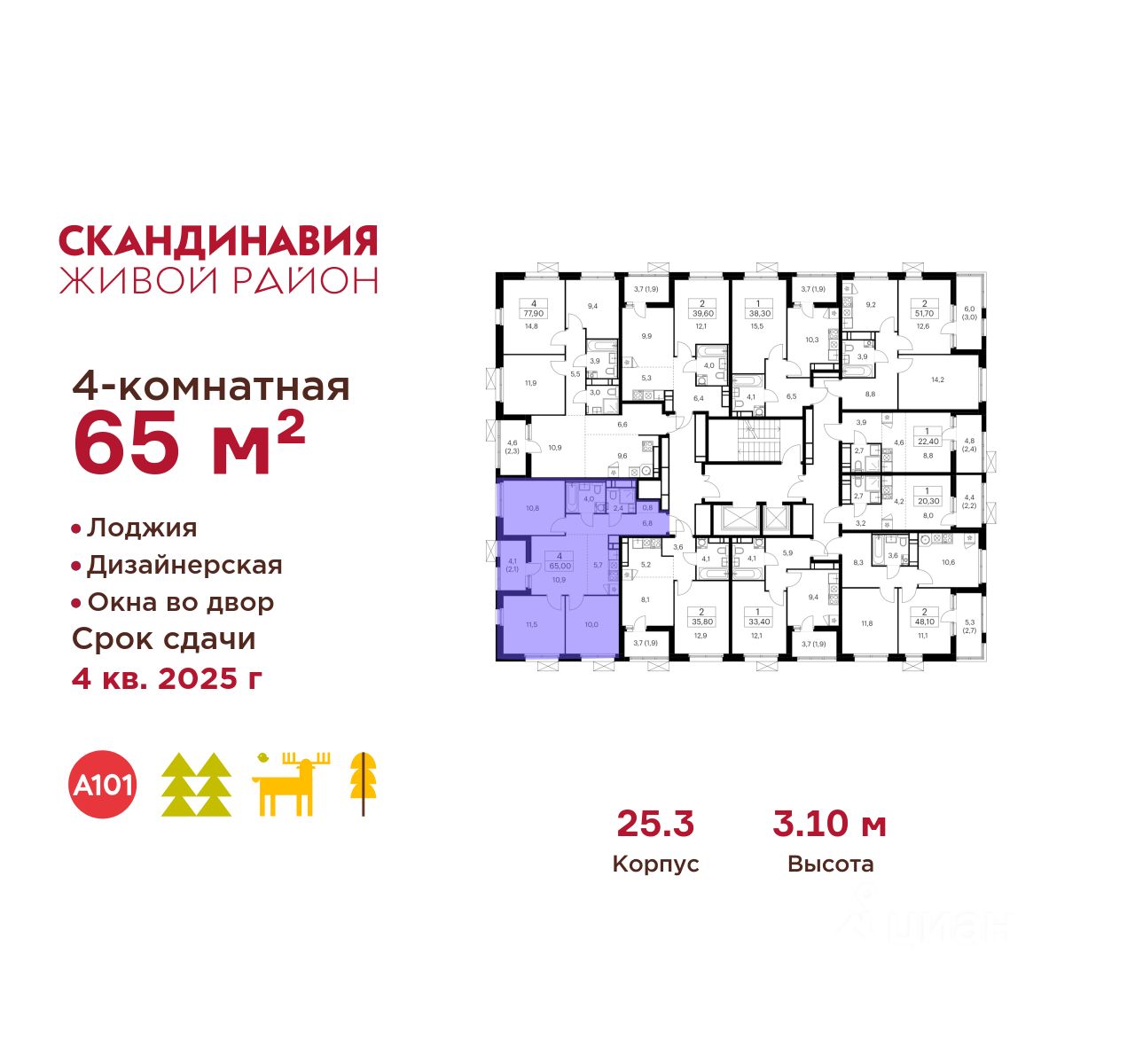 Продается четырехкомнатная квартира 451 в новостройке Жилой район "Скандинавия" по адресу Москва, ТиНАО, Новомосковский АО, Сосенское С/П, Коммунарка пос., жилой комплекс Скандинавия, 25.3, район Коммунарка, Новомосковский административный округ, Москва. Общая площадь квартиры - 65.00 кв. м., этаж 16 из 17, секция 3. Тип проекта, по которому построен дом - монолит, компания-застройщик - ООО "А101". Стоимость квартиры - 30113200 Р. Срок сдачи - 1 квартал 2026.