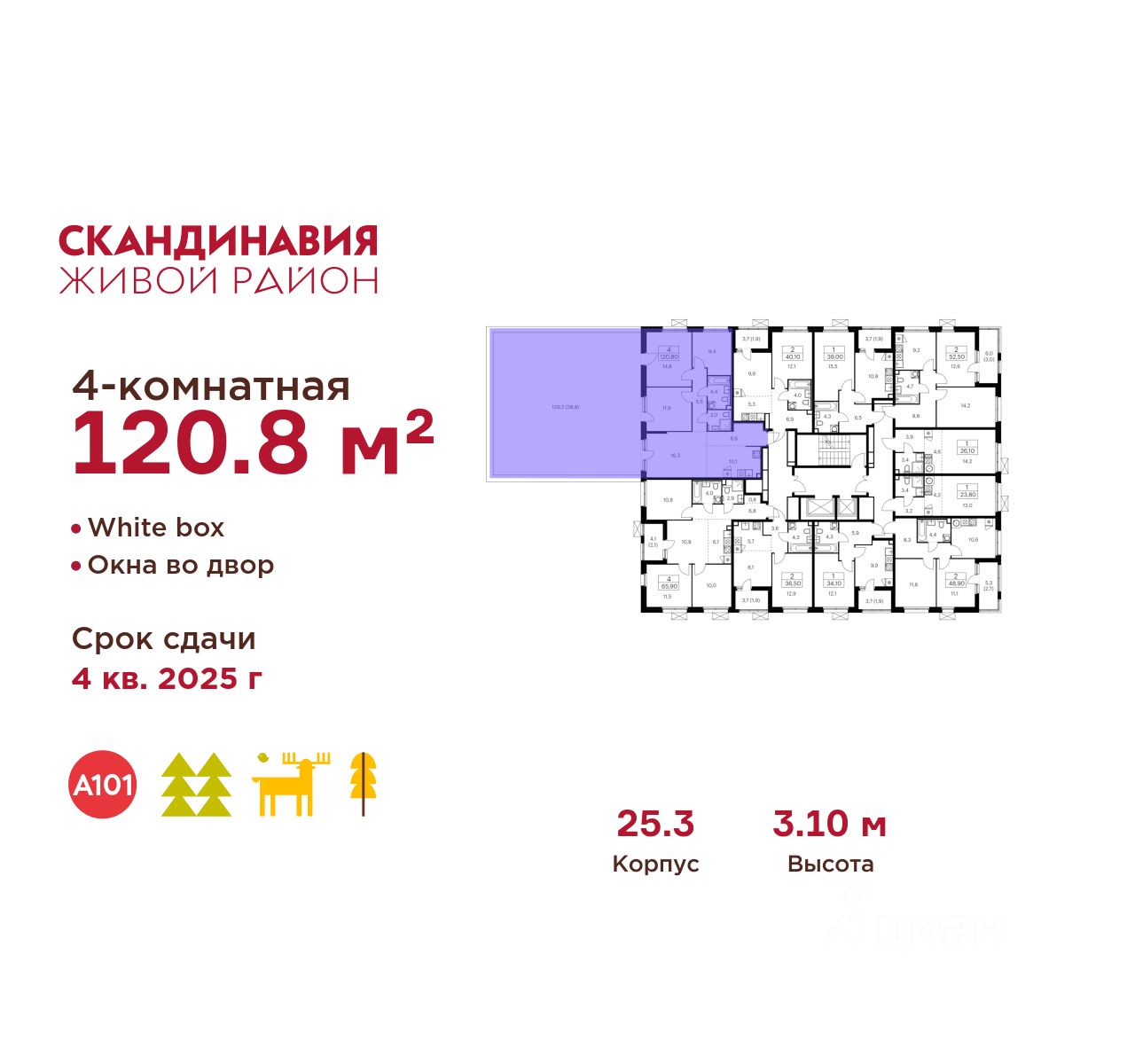 Продается четырехкомнатная квартира 312 в новостройке Жилой район "Скандинавия" по адресу Москва, ТиНАО, Новомосковский АО, Сосенское С/П, Коммунарка пос., жилой комплекс Скандинавия, 25.3, район Коммунарка, Новомосковский административный округ, Москва. Общая площадь квартиры - 120.80 кв. м., этаж 2 из 17, секция 3. Тип проекта, по которому построен дом - монолит, компания-застройщик - ООО "А101". Стоимость квартиры - 32091672 Р. Срок сдачи - 1 квартал 2026.
