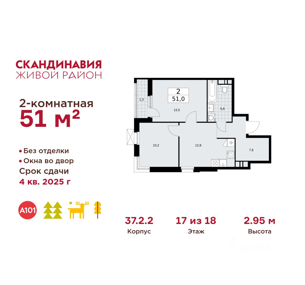 Продается двухкомнатная квартира 358 в новостройке Жилой район "Скандинавия" по адресу Москва, ТиНАО, Новомосковский АО, Сосенское С/П, Коммунарка пос., жилой комплекс Скандинавия, 37.2.2. Общая площадь квартиры - 51.00 кв. м., этаж 17 из 18, секция 2. Тип проекта, по которому построен дом - монолит, компания-застройщик - ООО "А101". Стоимость квартиры - 20216400 Р. Срок сдачи - 4 квартал 2025.