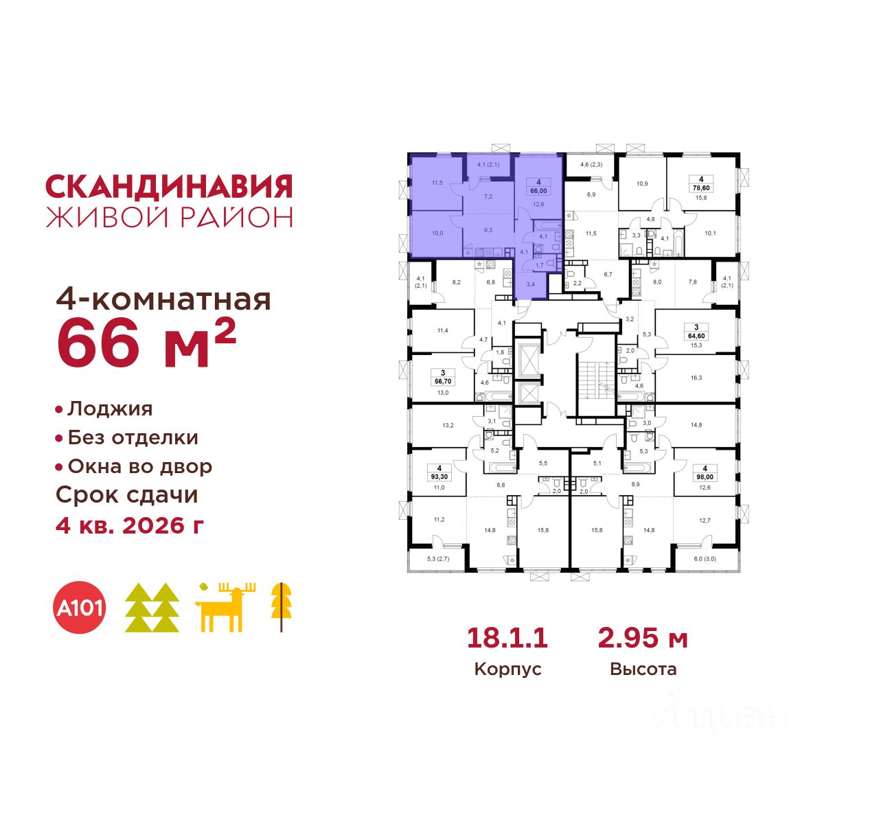 Продается четырехкомнатная квартира 34 в новостройке Жилой район "Скандинавия" по адресу Москва, ТиНАО, Новомосковский АО, Сосенское С/П, Коммунарка пос., жилой комплекс Скандинавия, 18.1.1, район Коммунарка, Новомосковский административный округ, Москва. Общая площадь квартиры - 66.00 кв. м., этаж 7 из 9, секция 1. Тип проекта, по которому построен дом - монолит, компания-застройщик - ООО "А101". Стоимость квартиры - 24654960 Р. Срок сдачи - 4 квартал 2026.