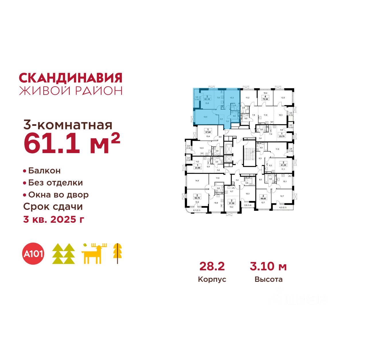 Продается трехкомнатная квартира 375 в новостройке Жилой район "Скандинавия" по адресу Москва, ТиНАО, Новомосковский АО, Сосенское С/П, Коммунарка пос., жилой комплекс Скандинавия, 28.2, район Коммунарка, Новомосковский административный округ, Москва. Общая площадь квартиры - 61.10 кв. м., этаж 11 из 16, секция 5. Тип проекта, по которому построен дом - монолит, компания-застройщик - ООО "А101". Стоимость квартиры - 25595401 Р. Срок сдачи - 4 квартал 2025.