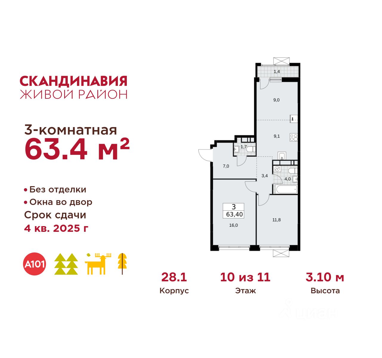 Продается трехкомнатная квартира 207 в новостройке Жилой район "Скандинавия" по адресу Москва, ТиНАО, Новомосковский АО, Сосенское С/П, Коммунарка пос., жилой комплекс Скандинавия, 28.1, район Коммунарка, Новомосковский административный округ, Москва. Общая площадь квартиры - 63.40 кв. м., этаж 10 из 11, секция 3. Тип проекта, по которому построен дом - монолит, компания-застройщик - ООО "А101". Стоимость квартиры - 22338990 Р. Срок сдачи - 4 квартал 2025.