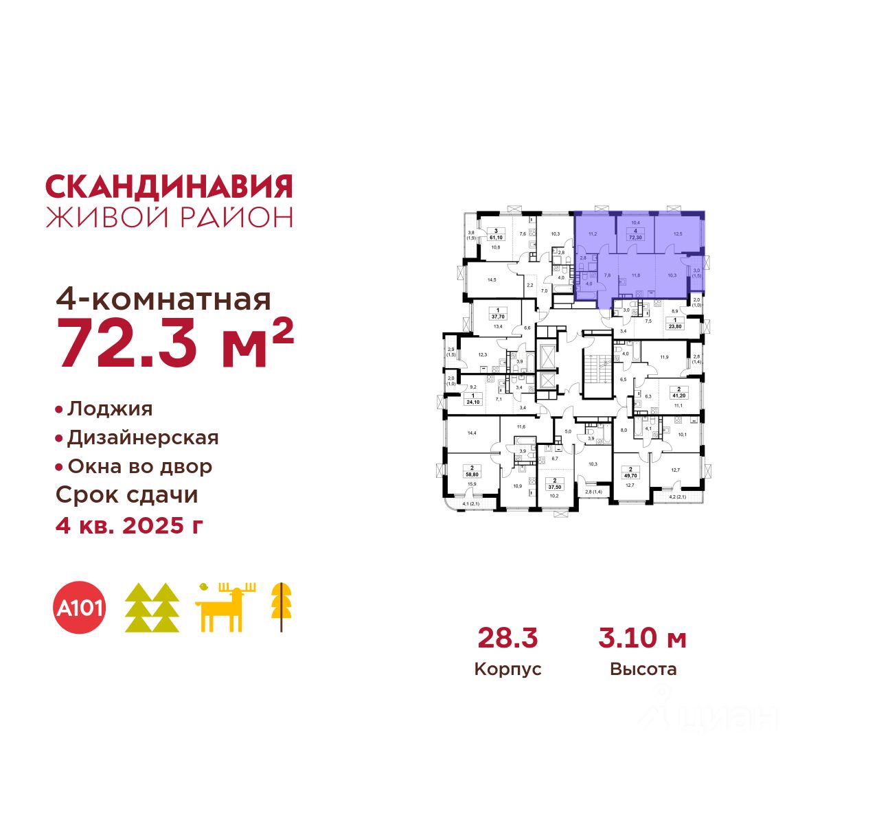Продается четырехкомнатная квартира 489 в новостройке Жилой район "Скандинавия" по адресу Москва, ТиНАО, Новомосковский АО, Сосенское С/П, Коммунарка пос., жилой комплекс Скандинавия, 28.3, район Коммунарка, Новомосковский административный округ, Москва. Общая площадь квартиры - 72.30 кв. м., этаж 9 из 17, секция 6. Тип проекта, по которому построен дом - монолит, компания-застройщик - ООО "А101". Стоимость квартиры - 36267126 Р. Срок сдачи - 4 квартал 2025.