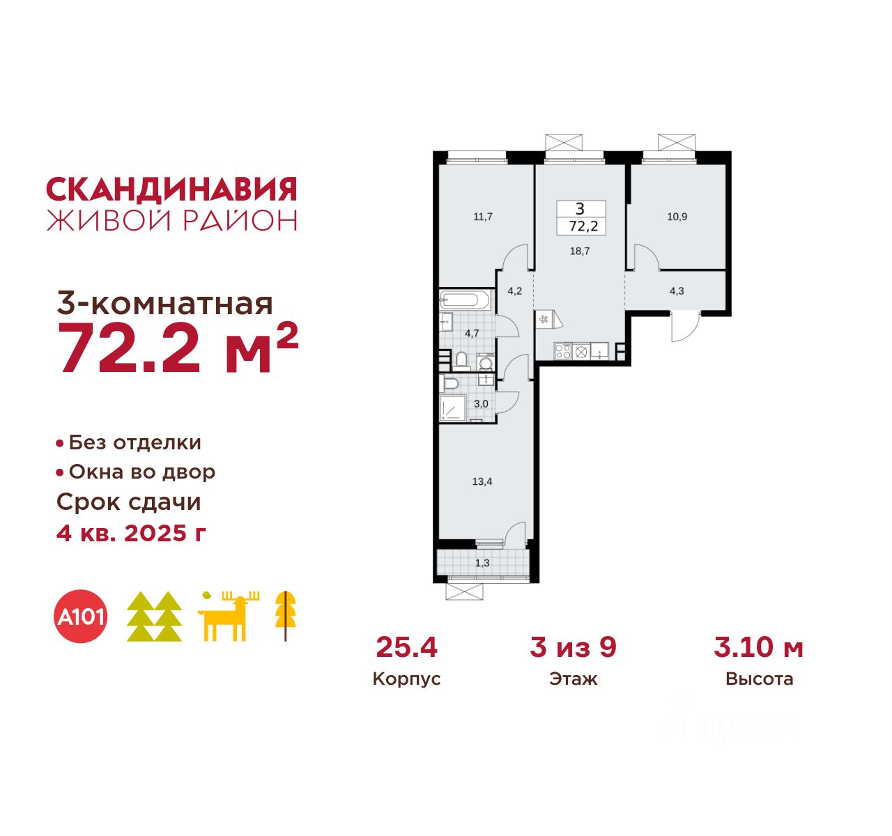 Продается трехкомнатная квартира 543 в новостройке Жилой район "Скандинавия" по адресу Москва, ТиНАО, Новомосковский АО, Сосенское С/П, Коммунарка пос., жилой комплекс Скандинавия, 25.4, район Коммунарка, Новомосковский административный округ, Москва. Общая площадь квартиры - 72.20 кв. м., этаж 3 из 9, секция 5. Тип проекта, по которому построен дом - монолит, компания-застройщик - ООО "А101". Стоимость квартиры - 26106798 Р. Срок сдачи - 1 квартал 2026.