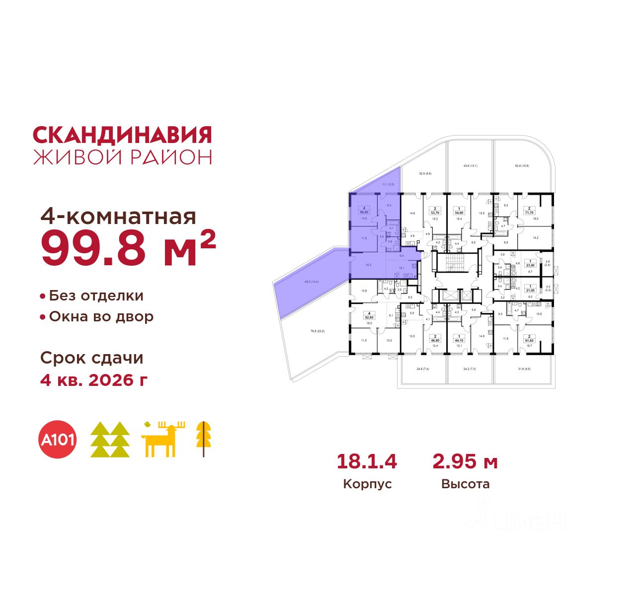 Продается четырехкомнатная квартира 367 в новостройке Жилой район "Скандинавия" по адресу Москва, ТиНАО, Новомосковский АО, Сосенское С/П, Коммунарка пос., жилой комплекс Скандинавия, 18.1.4, район Коммунарка, Новомосковский административный округ, Москва. Общая площадь квартиры - 99.80 кв. м., этаж 2 из 13, секция 4. Тип проекта, по которому построен дом - монолит, компания-застройщик - ООО "А101". Стоимость квартиры - 30390098 Р. Срок сдачи - 4 квартал 2026.