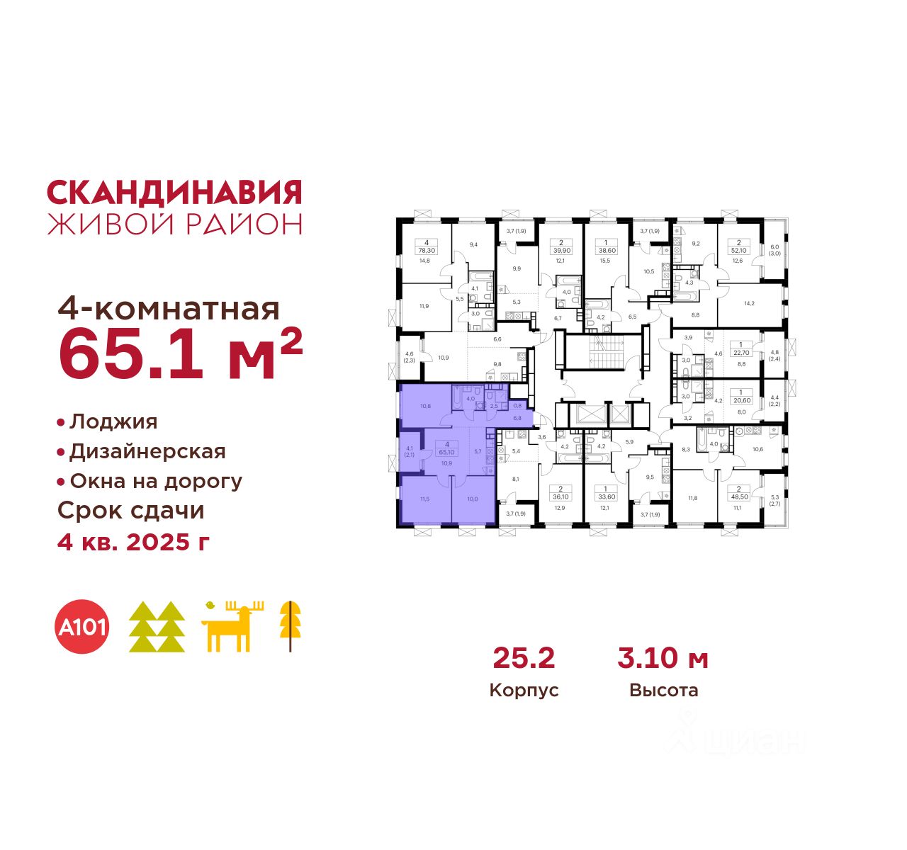 Продается четырехкомнатная квартира 201 в новостройке Жилой район "Скандинавия" по адресу Москва, ТиНАО, Новомосковский АО, Сосенское С/П, Коммунарка пос., жилой комплекс Скандинавия, 25.2, район Коммунарка, Новомосковский административный округ, Москва. Общая площадь квартиры - 65.10 кв. м., этаж 7 из 17, секция 2. Тип проекта, по которому построен дом - монолит, компания-застройщик - ООО "А101". Стоимость квартиры - 29648493 Р. Срок сдачи - 1 квартал 2026.