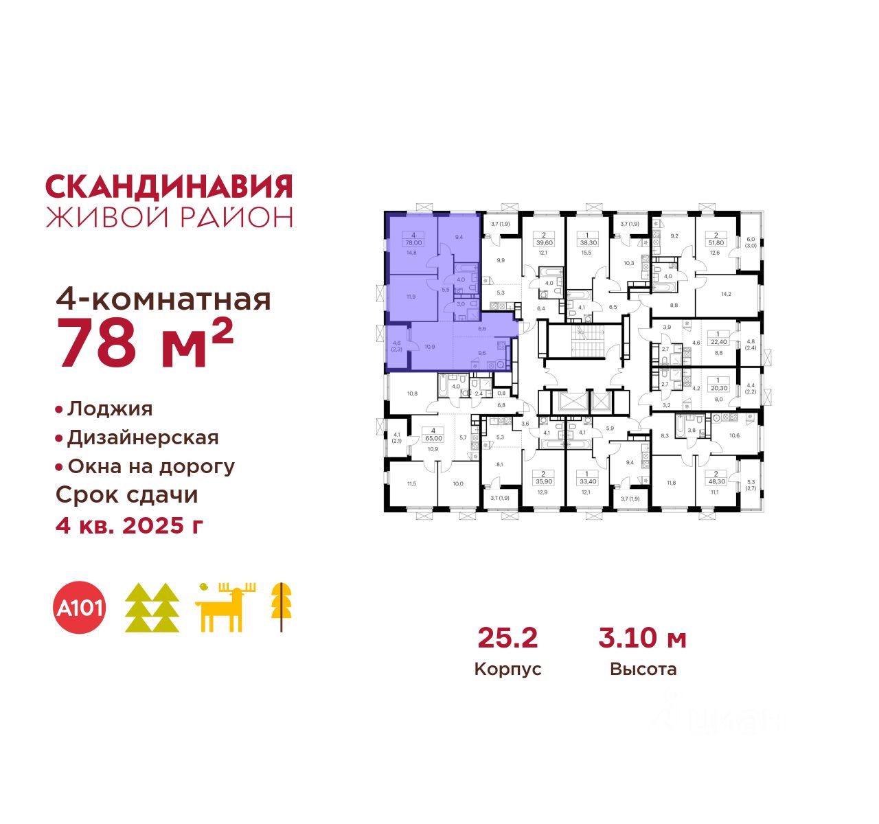 Продается четырехкомнатная квартира 272 в новостройке Жилой район "Скандинавия" по адресу Москва, ТиНАО, Новомосковский АО, Сосенское С/П, Коммунарка пос., жилой комплекс Скандинавия, 25.2, район Коммунарка, Новомосковский административный округ, Москва. Общая площадь квартиры - 78.00 кв. м., этаж 14 из 17, секция 2. Тип проекта, по которому построен дом - монолит, компания-застройщик - ООО "А101". Стоимость квартиры - 33705360 Р. Срок сдачи - 1 квартал 2026.