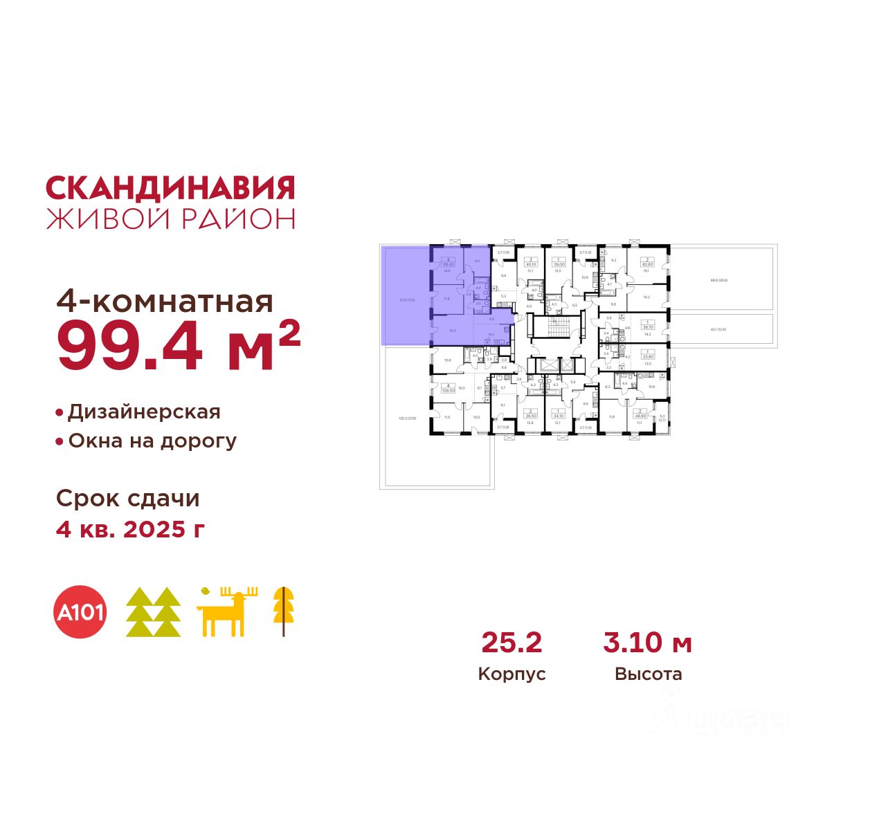 Продается четырехкомнатная квартира 152 в новостройке Жилой район "Скандинавия" по адресу Москва, ТиНАО, Новомосковский АО, Сосенское С/П, Коммунарка пос., жилой комплекс Скандинавия, 25.2, район Коммунарка, Новомосковский административный округ, Москва. Общая площадь квартиры - 99.40 кв. м., этаж 2 из 17, секция 2. Тип проекта, по которому построен дом - монолит, компания-застройщик - ООО "А101". Стоимость квартиры - 34947976 Р. Срок сдачи - 1 квартал 2026.