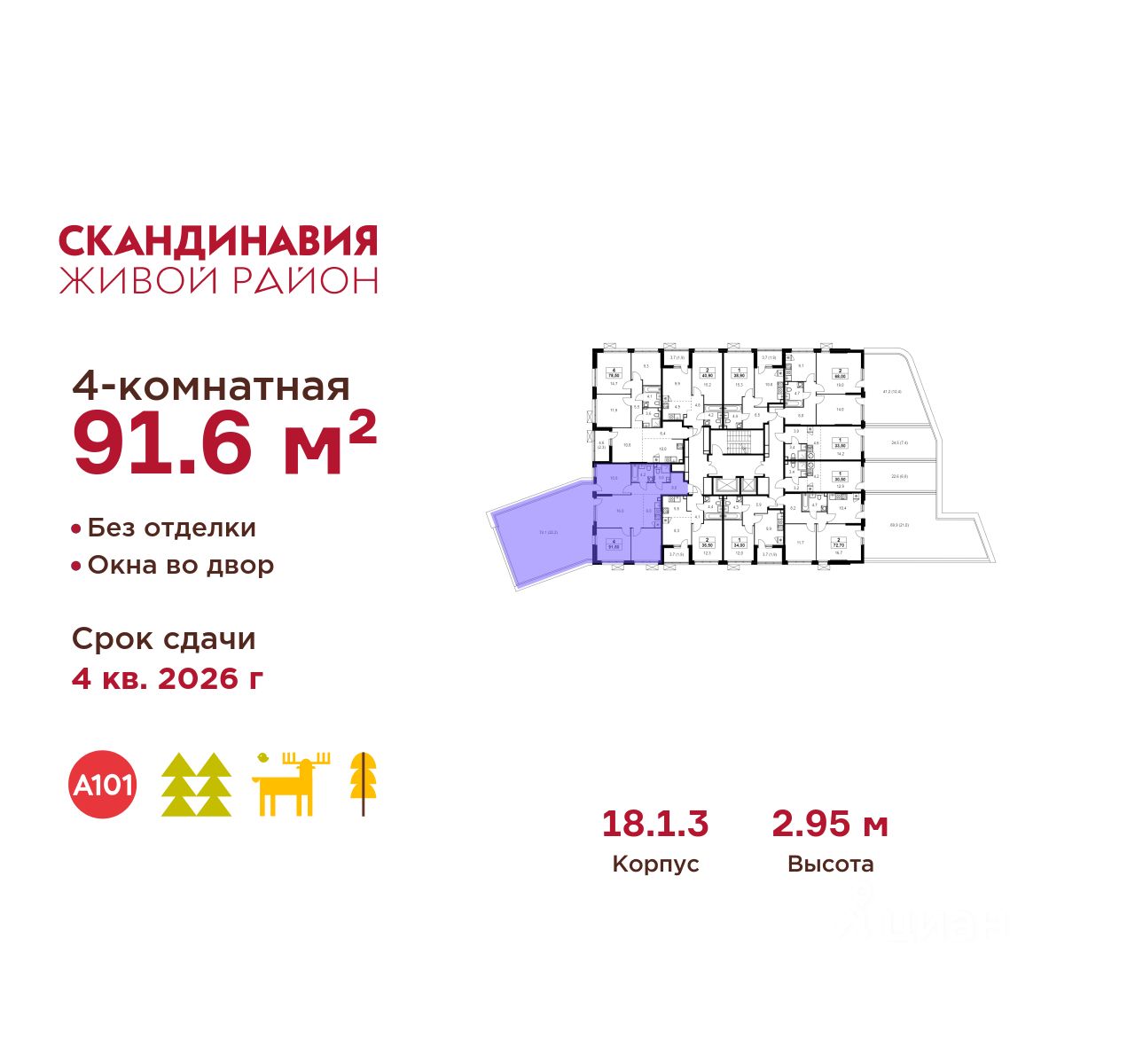 Продается четырехкомнатная квартира 186 в новостройке Жилой район "Скандинавия" по адресу Москва, ТиНАО, Новомосковский АО, Сосенское С/П, Коммунарка пос., жилой комплекс Скандинавия, 18.1.3, район Коммунарка, Новомосковский административный округ, Москва. Общая площадь квартиры - 91.60 кв. м., этаж 2 из 19, секция 3. Тип проекта, по которому построен дом - монолит, компания-застройщик - ООО "А101". Стоимость квартиры - 33461480 Р. Срок сдачи - 4 квартал 2026.