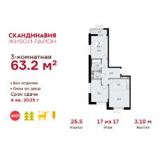 Продается трехкомнатная квартира 831 в новостройке Жилой район "Скандинавия" по адресу Москва, ТиНАО, Новомосковский АО, Сосенское С/П, Коммунарка пос., жилой комплекс Скандинавия, 25.5. Общая площадь квартиры - 63.20 кв. м., этаж 17 из 17, секция 9. Тип проекта, по которому построен дом - монолит, компания-застройщик - ООО "А101". Стоимость квартиры - 24954520 Р. Срок сдачи - 1 квартал 2026.