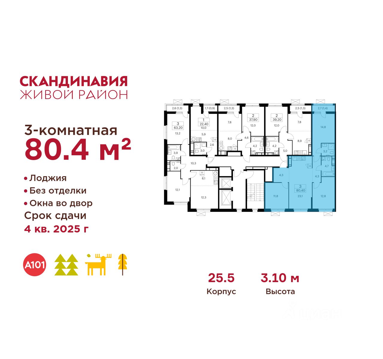 Продается трехкомнатная квартира 825 в новостройке Жилой район "Скандинавия" по адресу Москва, ТиНАО, Новомосковский АО, Сосенское С/П, Коммунарка пос., жилой комплекс Скандинавия, 25.5. Общая площадь квартиры - 80.40 кв. м., этаж 15 из 17, секция 9. Тип проекта, по которому построен дом - монолит, компания-застройщик - ООО "А101". Стоимость квартиры - 28677876 Р. Срок сдачи - 1 квартал 2026.