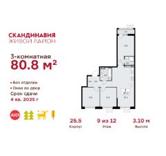 Продается трехкомнатная квартира 737 в новостройке Жилой район "Скандинавия" по адресу Москва, ТиНАО, Новомосковский АО, Сосенское С/П, Коммунарка пос., жилой комплекс Скандинавия, 25.5. Общая площадь квартиры - 80.80 кв. м., этаж 9 из 12, секция 8. Тип проекта, по которому построен дом - монолит, компания-застройщик - ООО "А101". Стоимость квартиры - 27807320 Р. Срок сдачи - 4 квартал 2025.