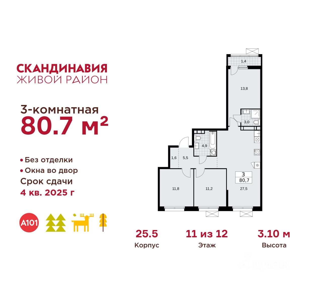 Продается трехкомнатная квартира 749 в новостройке Жилой район "Скандинавия" по адресу Москва, ТиНАО, Новомосковский АО, Сосенское С/П, Коммунарка пос., жилой комплекс Скандинавия, 25.5. Общая площадь квартиры - 80.70 кв. м., этаж 11 из 12, секция 8. Тип проекта, по которому построен дом - монолит, компания-застройщик - ООО "А101". Стоимость квартиры - 28062618 Р. Срок сдачи - 4 квартал 2025.