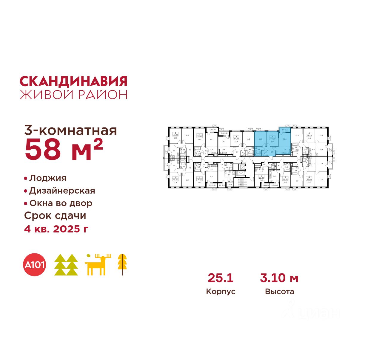 Продается трехкомнатная квартира 139 в новостройке Жилой район "Скандинавия" по адресу Москва, ТиНАО, Новомосковский АО, Сосенское С/П, Коммунарка пос., жилой комплекс Скандинавия, 25.1, район Коммунарка, Новомосковский административный округ, Москва. Общая площадь квартиры - 58.00 кв. м., этаж 14 из 14, секция 1. Тип проекта, по которому построен дом - монолит, компания-застройщик - ООО "А101". Стоимость квартиры - 26839500 Р. Срок сдачи - 1 квартал 2026.