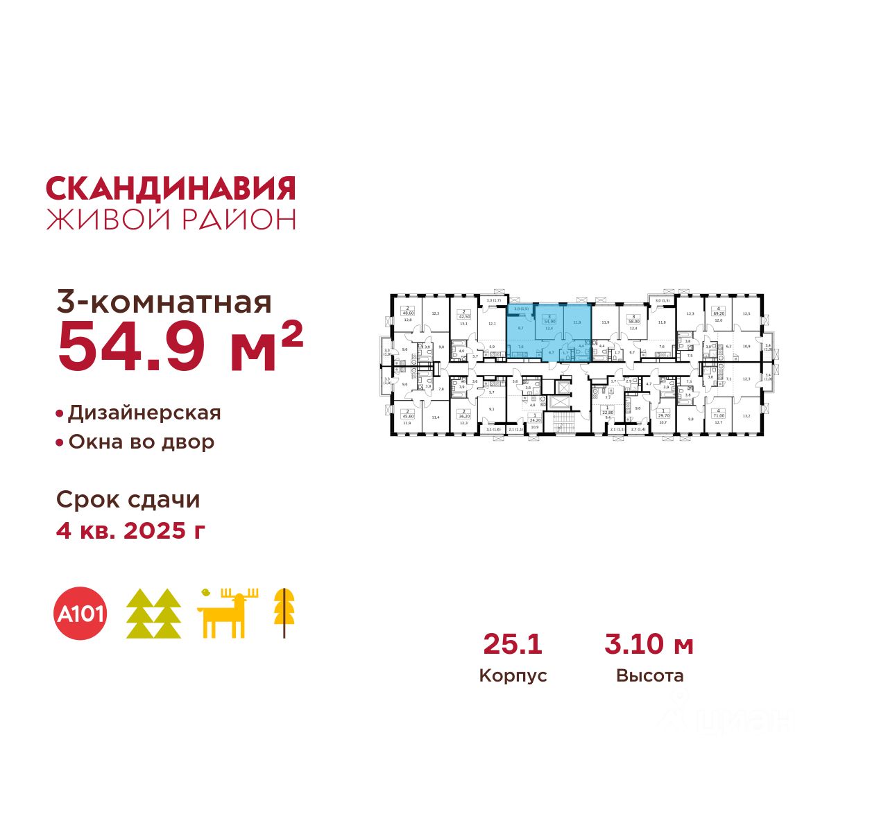 Продается трехкомнатная квартира 127 в новостройке Жилой район "Скандинавия" по адресу Москва, ТиНАО, Новомосковский АО, Сосенское С/П, Коммунарка пос., жилой комплекс Скандинавия, 25.1, район Коммунарка, Новомосковский административный округ, Москва. Общая площадь квартиры - 54.90 кв. м., этаж 13 из 14, секция 1. Тип проекта, по которому построен дом - монолит, компания-застройщик - ООО "А101". Стоимость квартиры - 29432439 Р. Срок сдачи - 1 квартал 2026.