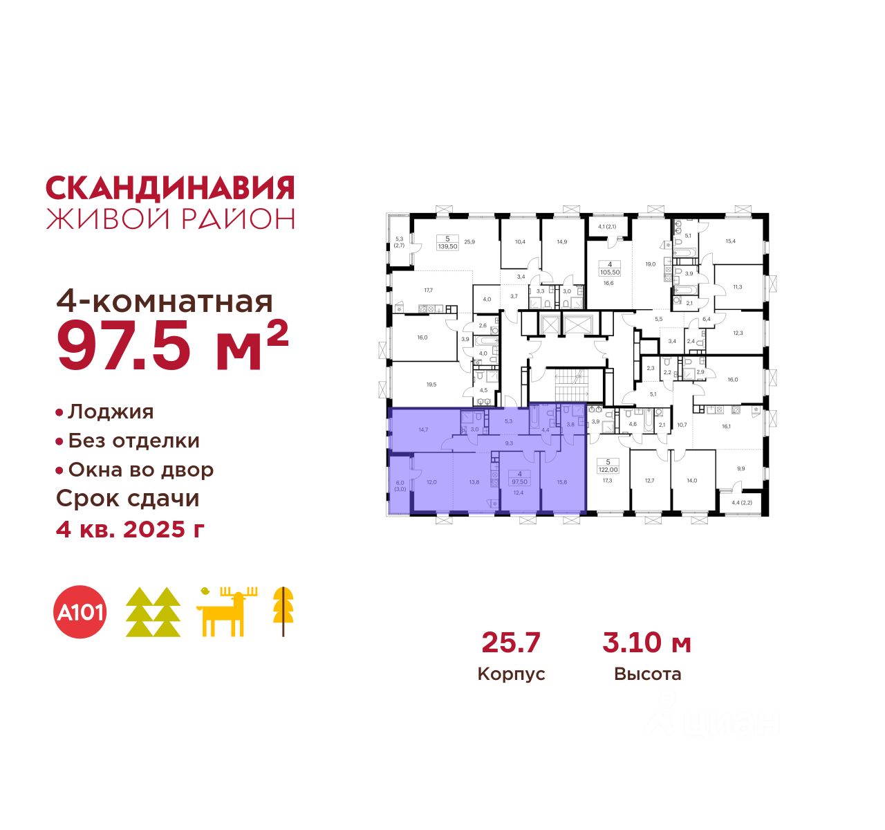 Продается четырехкомнатная квартира 1080 в новостройке Жилой район "Скандинавия" по адресу Москва, ТиНАО, Новомосковский АО, Сосенское С/П, Коммунарка пос., жилой комплекс Скандинавия, 25.7, район Коммунарка, Новомосковский административный округ, Москва. Общая площадь квартиры - 97.50 кв. м., этаж 15 из 17, секция 12. Тип проекта, по которому построен дом - монолит, компания-застройщик - ООО "А101". Стоимость квартиры - 37441950 Р. Срок сдачи - 1 квартал 2026.