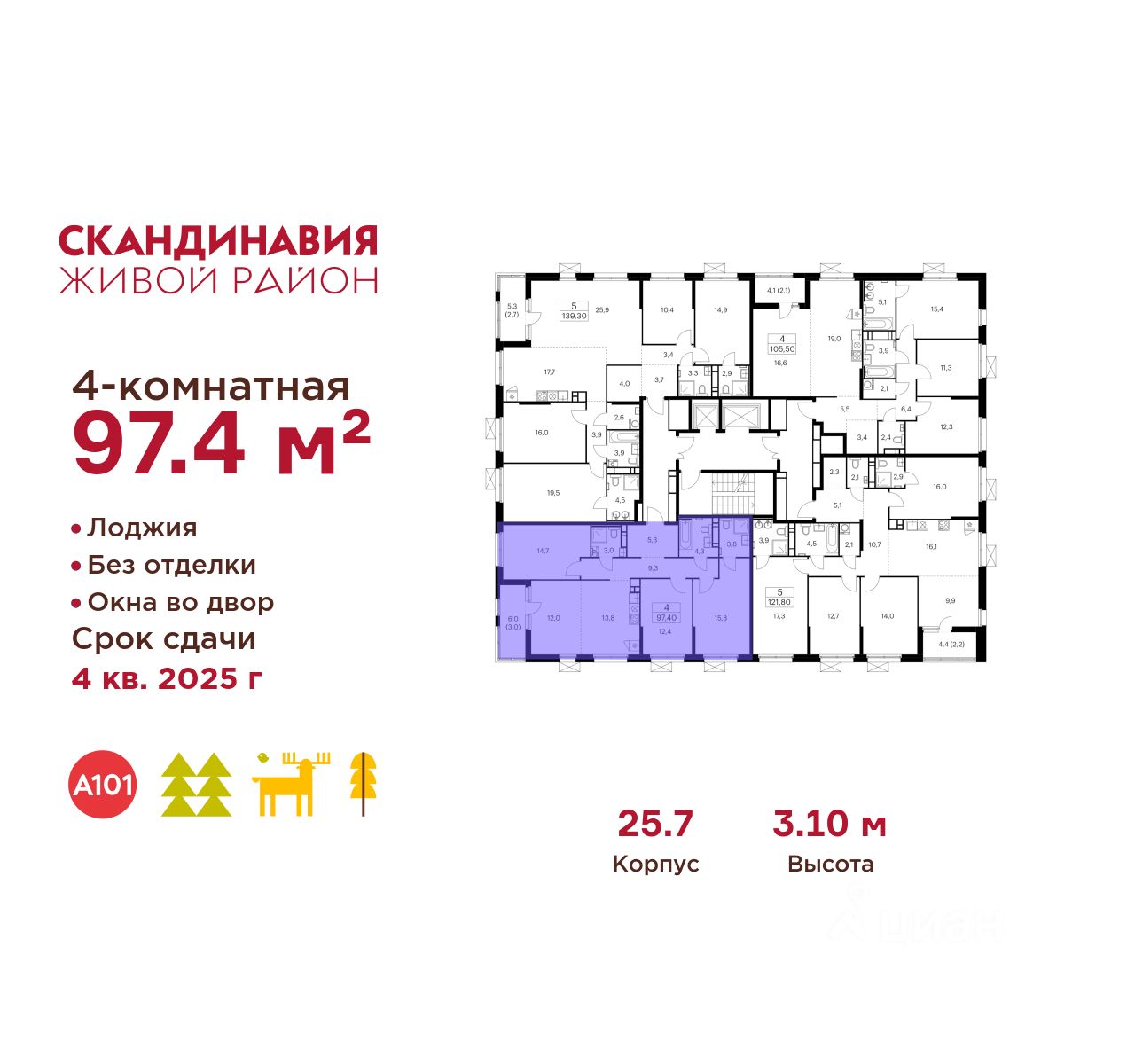 Продается четырехкомнатная квартира 1084 в новостройке Жилой район "Скандинавия" по адресу Москва, ТиНАО, Новомосковский АО, Сосенское С/П, Коммунарка пос., жилой комплекс Скандинавия, 25.7, район Коммунарка, Новомосковский административный округ, Москва. Общая площадь квартиры - 97.40 кв. м., этаж 16 из 17, секция 12. Тип проекта, по которому построен дом - монолит, компания-застройщик - ООО "А101". Стоимость квартиры - 35805214 Р. Срок сдачи - 1 квартал 2026.
