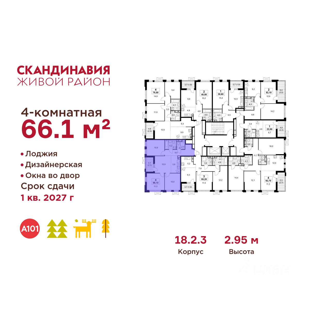 Продается четырехкомнатная квартира 399 в новостройке Жилой район "Скандинавия" по адресу Москва, ТиНАО, Новомосковский АО, Сосенское С/П, Коммунарка пос., жилой комплекс Скандинавия, 18.2.3, район Коммунарка, Новомосковский административный округ, Москва. Общая площадь квартиры - 66.10 кв. м., этаж 14 из 18, секция 5. Тип проекта, по которому построен дом - монолит, компания-застройщик - ООО "А101". Стоимость квартиры - 26256903 Р. Срок сдачи - 1 квартал 2027.