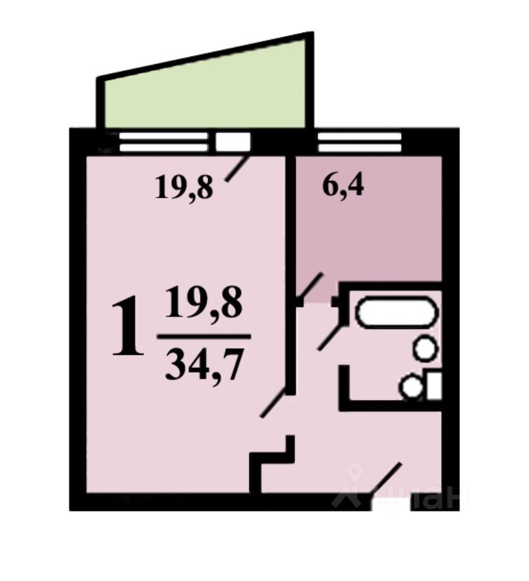 - Общая площадь — 33.3 м2. Жилая комната 19,8м2;