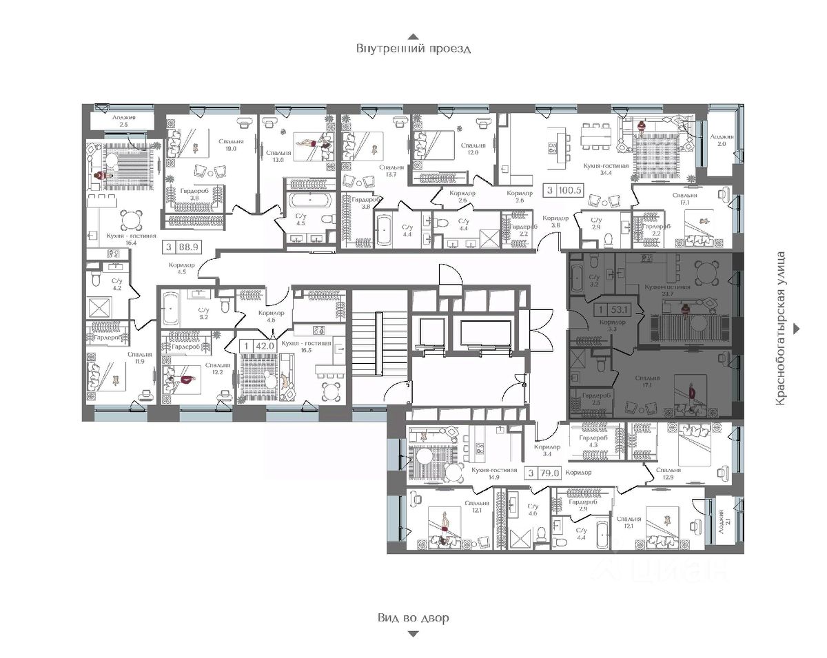 Квартира на 2 этаже в жилом комплексе премиум-класса "Преображенская площадь". Общая площадь: 53.1 кв.м.