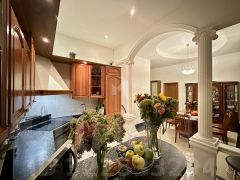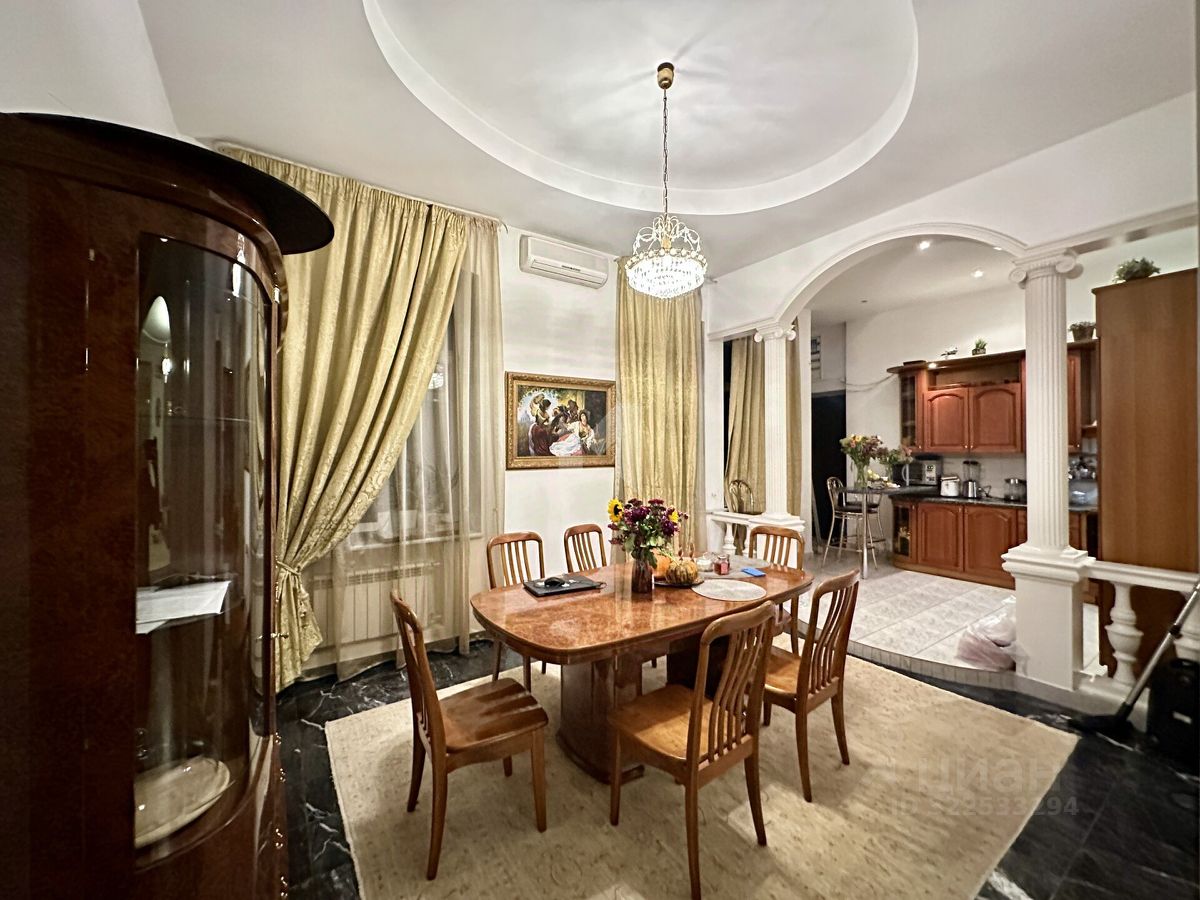 Кухня площадью 32 квадратных метра является функциональным пространством, подходящим для семейных трапез и приема гостей. В квартире имеются два совмещенных санузла. Окна выходят во внутренний двор, отличающийся тихой и спокойной атмосферой.