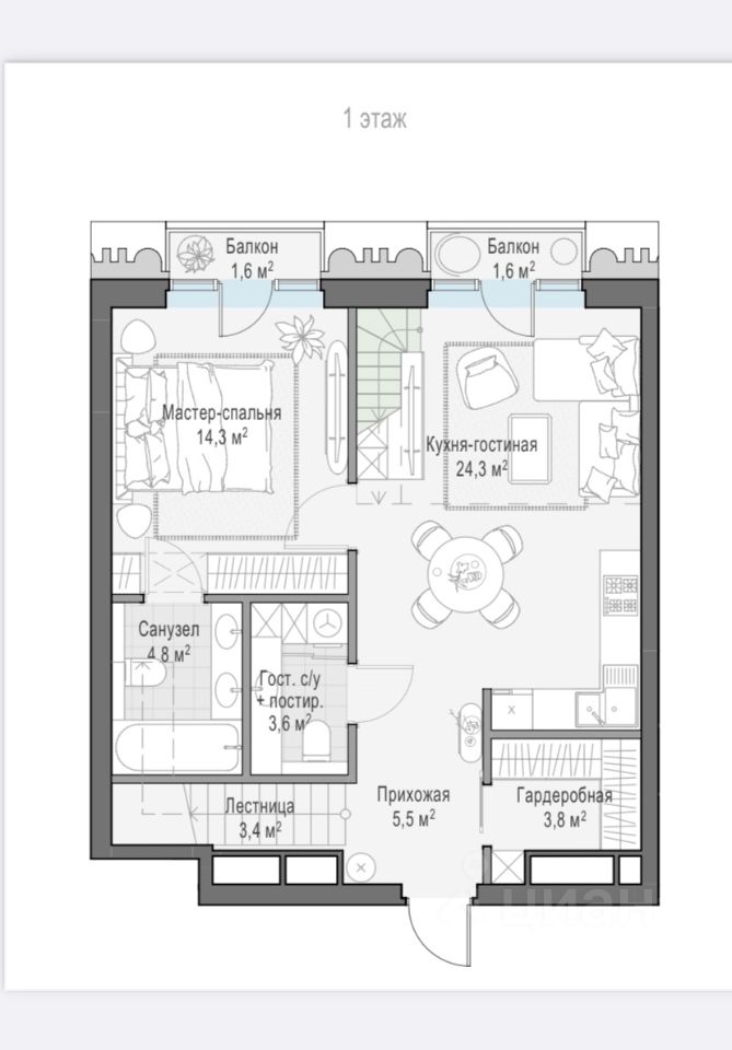 Свободная планировка позволяет реализовать несколько планировочных решений, например : со вторым светом , с двумя гардеробными комнатами, с большой кухней-гостиной с выходом на балкон и с двумя мастер -спальнями, так же можно сделать две лестницы или одну, на ваш выбор. Планировочные решения можем вам отправить по запросу.