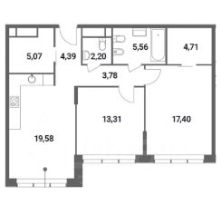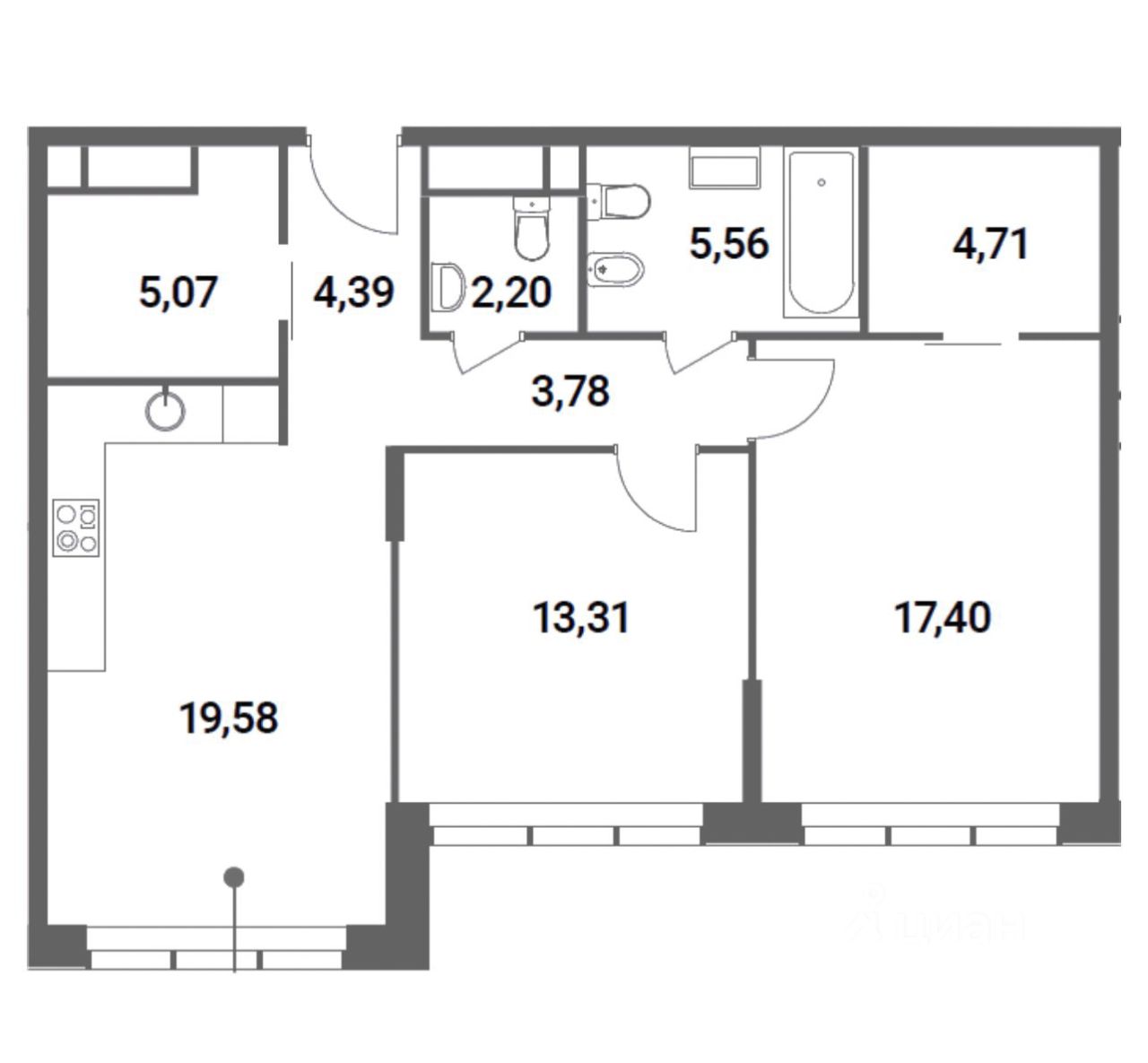 1 сaнузел, cпальня с гардеробной. Просторная кухня-гостиная.