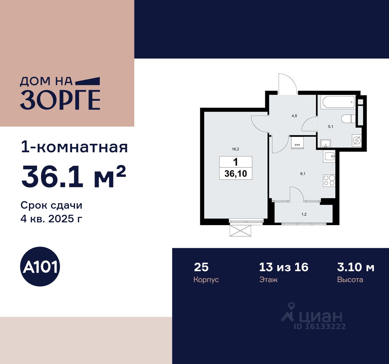 Продается однокомнатная квартира 150 в новостройке ЖК "Дом на Зорге" по адресу Москва, САО, Сокол, улица Зорге, 25с2, Москва, 125252. Общая площадь квартиры - 36.10 кв. м., этаж 13 из 16, секция 1. Тип проекта, по которому построен дом - монолит, компания-застройщик - ООО "А101". Стоимость квартиры - 26308442 Р. Срок сдачи - 4 квартал 2025.