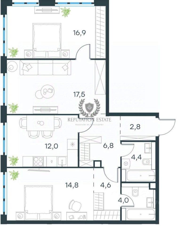 Квартира современной планировки: 3-х комнатная Евро 83.8 кв.м. с большой кухней-гостинной 17.5 кв.м.