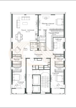 В квартире всего одна несущая колонна при входе и 4 мокрые точки. В квартире легко планируются очень просторная кухня-гостиная, 3 мастер-спальни со своими ванными и гардеробными и кабинет. Один из вариантов планировки есть в объявлении.