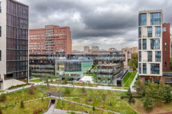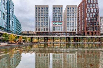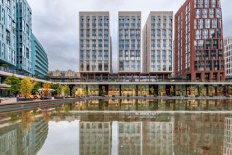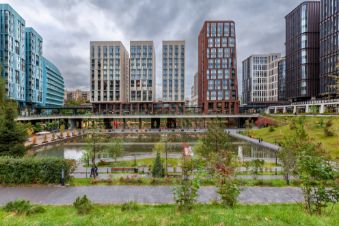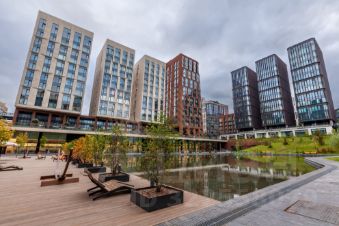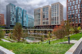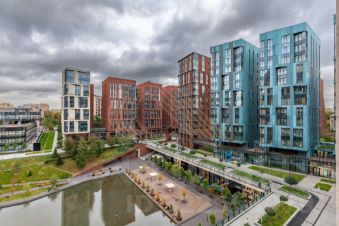 Квартира на 16 панорамных окон в пол с прямыми видами на пруд и МГУ, занимающая весь 6 этаж клубного корпуса 2.3, отделанного светлым камнем по проекту Сергея Скуратова.